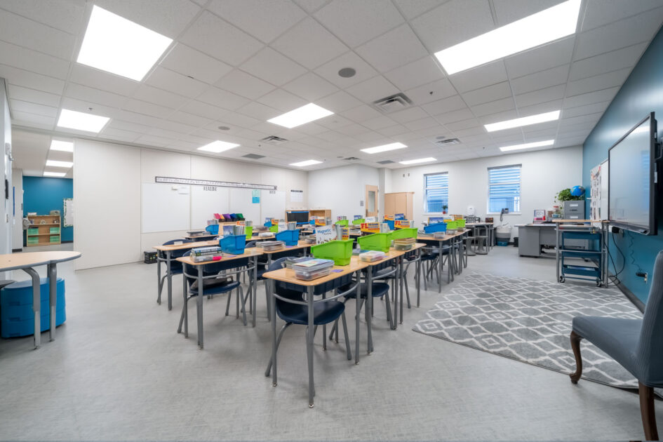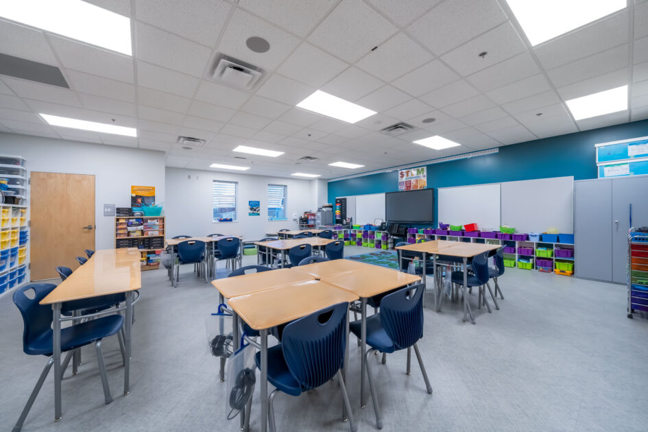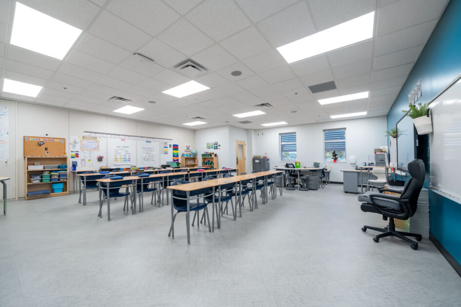 A new two-story classroom building with 196 student stations was the main focus of this expansion. Supporting the new building were sitework improvements and a new central energy plant. The existing elementary school remained fully functional during demolition and construction. The classroom building was constructed of concrete tilt-wall with a structural steel frame. The interior space was comprised of 10 new classrooms (6 with movable partitions that allowed them to double in size), 2 extended learning rooms, and 2 large teacher planning rooms. Sitework included new stormwater control drains and basins, improvements to the existing driveways, and new sidewalks with canopies, along with 28 additional parking spaces. The new central energy plant included an 80-ton air-cooled package chiller with integrated pumps and a 1,300 gpm air separator. New Building Automation Systems were also commissioned and connected to the campus.